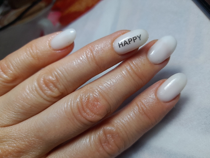 The image presents a close-up, overhead view of a light-skinned human left hand. The hand rests on a white, subtly textured surface, likely a paper towel or similar clean material. Four fingers are visible: index, middle, ring, and pinky, slightly splayed, with the thumb out of frame. The skin shows visible creases at the knuckles and appears moisturized. All visible fingernails are manicured to an oval shape and coated with a glossy, milky-white or translucent white nail polish. The nail on the middle finger conspicuously displays the word "HAPPY" in black, uppercase letters. The background is out of focus, showing indistinct light-colored elements, suggesting an indoor environment. No visual information within the image identifies a specific location in the city of Yerevan, Armenia.