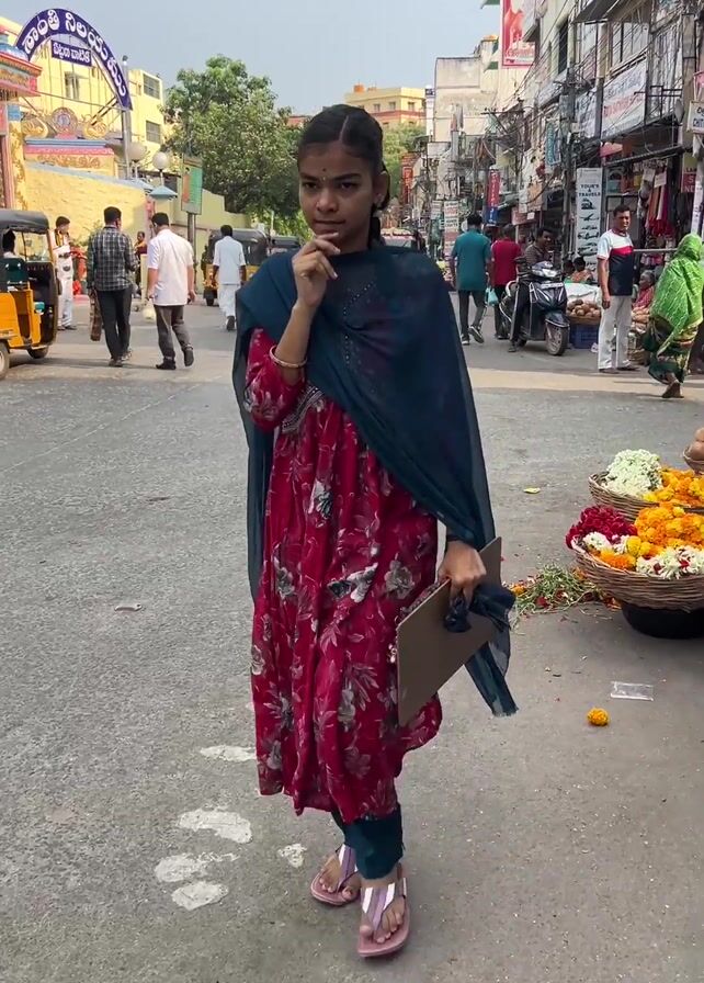 street scene in India. A young woman in a red floral dress with a blue shawl walks along a road towards the camera. She holds a tablet. To her right are baskets of flowers and other small items for sale. In the background, people walk along the busy street. Auto rickshaws and motorcycles drive by. The camera then pans to show a yellow auto rickshaw parked near a temple. Posters of Sri Sai Baba are on the temple wall. A man sits on the ground near a barrier that says "Andhra Pradesh Police".