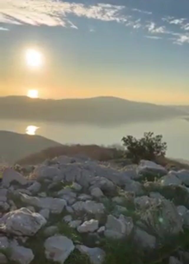 The video showcases a scenic view from a mountain peak, overlooking a body of water reflecting the sun