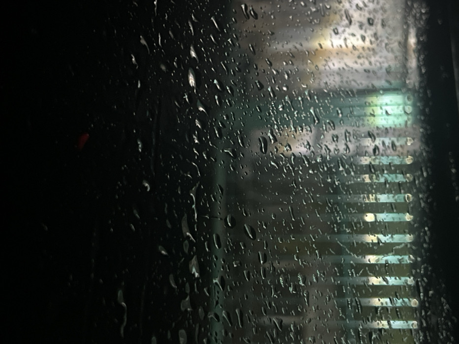- "The image depicts an exterior scene at night, viewed through a transparent surface heavily covered with numerous water droplets of varying sizes" by FM-soC9r1, licensed under CC BY 4.0
