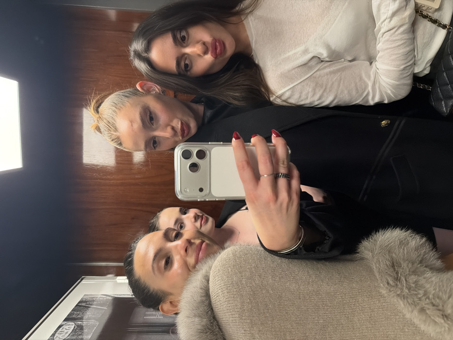 The image depicts five females in an enclosed interior space, identified as an elevator in Milan, Italy. The background features polished wooden paneling on the right wall and a dark, reflective surface on the left, which shows a faint, illegible reflection. A rectangular light fixture is visible on the ceiling. One individual, positioned centrally and slightly to the left, holds a white-cased smartphone in her left hand, angled upwards, taking a selfie. She wears a black blazer, has dark hair, and her fingernails are painted red with a silver ring on her left ring finger. She displays a slight smile. To her immediate left, another female with dark hair is partially obscured, wearing a dark top and a thin necklace, also subtly smiling. Further left, a third female, primarily visible from the chest up, wears a light beige ribbed sweater with a prominent fur trim and exhibits a broad smile. To the right of the person taking the selfie, a fourth female with blonde hair, styled in a high ponytail, poses with pursed lips. She wears a dark top. Adjacent to her on the far right, a fifth female with long dark hair also poses with pursed lips, wearing a long-sleeved sheer white top over a lighter garment and carrying a black quilted bag with a chain strap over her shoulder.