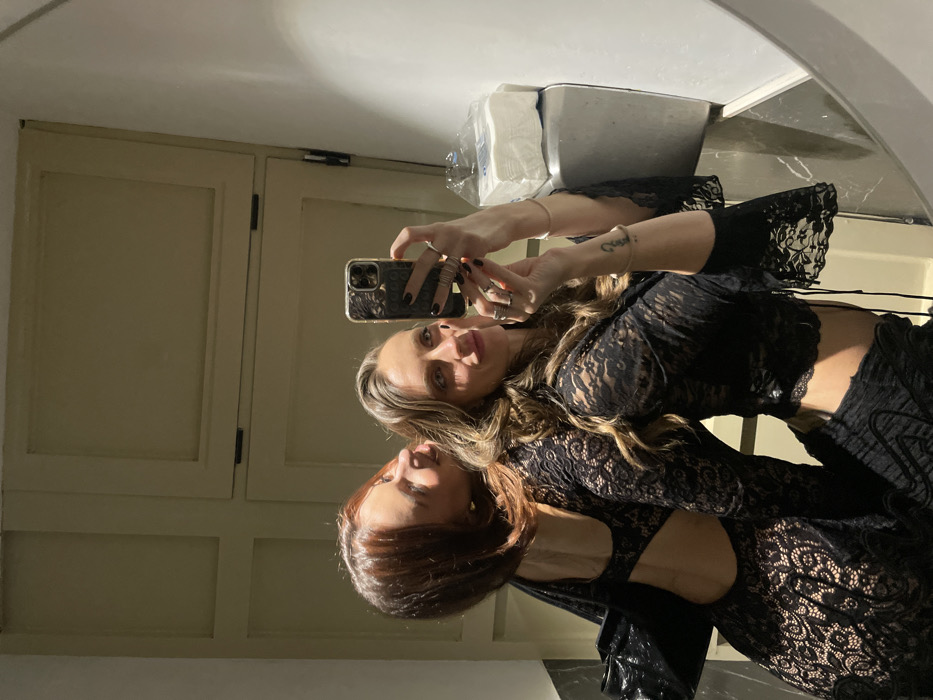 Two women pose for a mirror selfie. The woman holding the phone has long blonde hair and is wearing a black lace outfit with a cutout back. A tattoo is visible on her arm. The other woman, reflected in the mirror, has auburn hair and is also wearing black lace. A tissue dispenser is above the mirror, and a cream-colored door is to the side. The mirror's reflection shows bathroom fixtures.