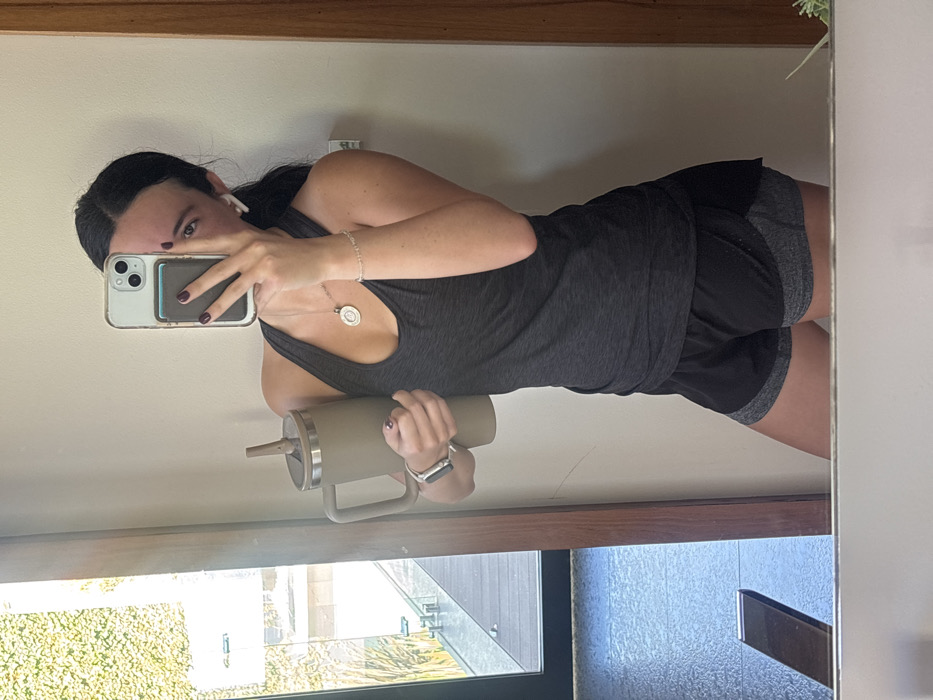 A woman poses for a mirror selfie. She wears a gray tank top, black shorts, and an Apple Watch. Her hair is black, and she has a red mark on her forehead. In her left hand, she holds a large, beige water bottle with a straw. She is using her right hand to hold her iPhone. The reflection in the mirror reveals a wooden frame and a window with greenery visible outside.