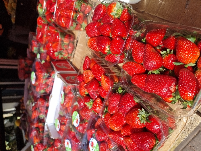 - "This image displays a market stall in Ramat Gan, Israel, heavily stocked with numerous transparent plastic punnets filled with fresh, ripe red strawberries" by FM-Uq0Y63, licensed under CC BY 4.0