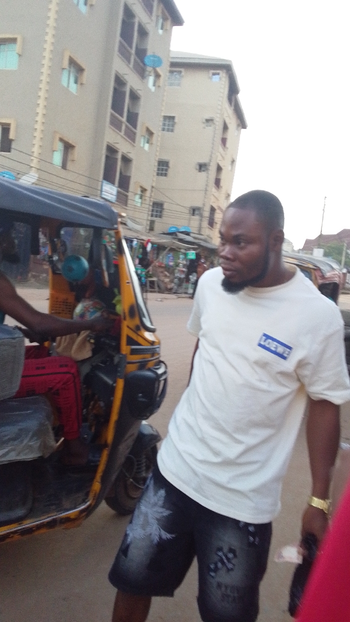 The image depicts an urban street scene in Onitsha, Nigeria. In the foreground, an adult male with dark skin and a short beard stands on the right, looking left. He wears a white short-sleeved t-shirt with a blue "LOEWE" logo, dark shorts with white palm tree and skull designs, and a gold-colored watch on his left wrist. His right hand holds a dark object next to a blurred red element. To his left, a yellow and black motorized tricycle (keke napep) is stationary. The driver, an adult male with dark skin, is partially visible from the torso up, seated inside, wearing a dark sleeveless top. A red bag is visible on the tricycle's passenger seat, which is covered with a dark plastic sheet. A blue spherical object hangs within the tricycle's passenger compartment. The ground is a dirt or unpaved road. In the background, two multi-story light-beige buildings with numerous windows and balconies are visible; one building features a blue satellite dish. Beyond the tricycle, informal market stalls with goods and blue covers are present. The sky is bright and hazy.