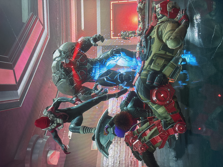A chaotic scene depicts a futuristic battle. Miles Morales, in his Spider-Man suit with a red beanie, kicks upward. Two armored figures engage in combat; one with a blue energy surge is being attacked. A soldier-like character in green and red armor is pinned against a wall. The setting is industrial, with red and white architectural elements visible. Debris and bright colors contribute to the dynamic action.