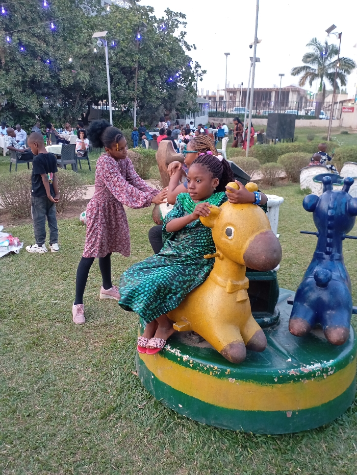 A playground scene shows two young girls near a carousel-like ride. One girl, wearing a floral dress, stands and reaches out to the seated girl. The seated girl, adorned in a green dress, sits on a yellow giraffe ride. Behind them, a woman with braided hair is seated. The backdrop includes a grassy park setting with people gathered at tables, trees lit with string lights, and a palm tree.