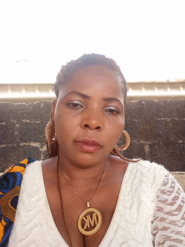 A female individual is depicted in a close-up, selfie-style portrait. She has dark skin, braided hair, and wears silver eyeshadow with lip color. She is adorned with large, textured, gold-colored hoop earrings and a gold-colored necklace featuring a large, circular pendant with intertwined "MK" letters. Her attire consists of a white, textured V-neck top or dress, with a blue, orange, and black patterned fabric visible on her left side. The background comprises a dark, rough-textured wall, topped by a lighter, corrugated structure, with the upper portion overexposed white, indicating bright overhead illumination. Location: Unknown, Unknown.