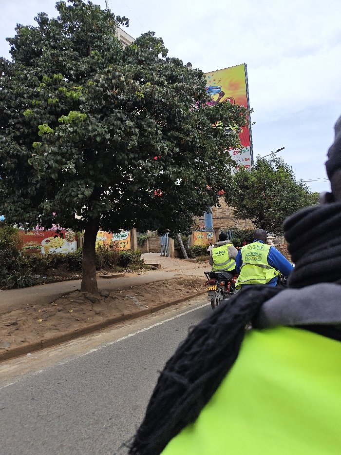 A street scene shows two motorcycles on the road, their drivers wearing bright yellow vests. A large, full tree stands to the left of the road, and a billboard can be seen in the background. On the left sidewalk, there's a poster or advertisement for food products. A person in a bright yellow vest, likely the photographer, is partially visible in the foreground. The day is bright, and the sky is overcast.