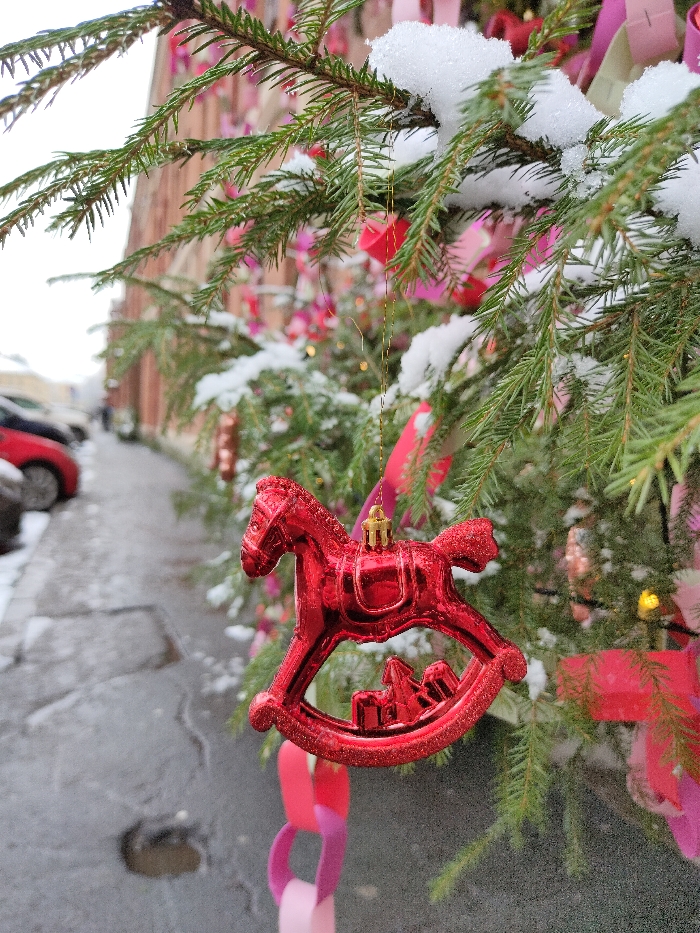This image depicts a winter street scene in Saint Petersburg, Russia. In the foreground, a glossy red plastic rocking horse ornament, approximately 10-15 cm tall with glittered accents on its base and mane, hangs from a snow-covered green fir branch. The ornament features three smaller Christmas tree shapes within its frame and is suspended by a small golden loop and string. The fir branches, also partially covered in white snow, are adorned with multiple red and pink ribbons and pink paper chains. Fine strands of golden tinsel hang among the needles. Below the decorated branches, a wet, dark grey asphalt sidewalk with patches of melting snow and a small puddle is visible. In the midground, a building with a reddish-brown facade and visible window frames stands behind the decorated fir greenery. The background shows a street with parked vehicles, including a prominent red car, extending along the left side of the sidewalk. A single, indistinct human figure is visible walking in the far distance on the sidewalk. The sky is overcast and bright white.