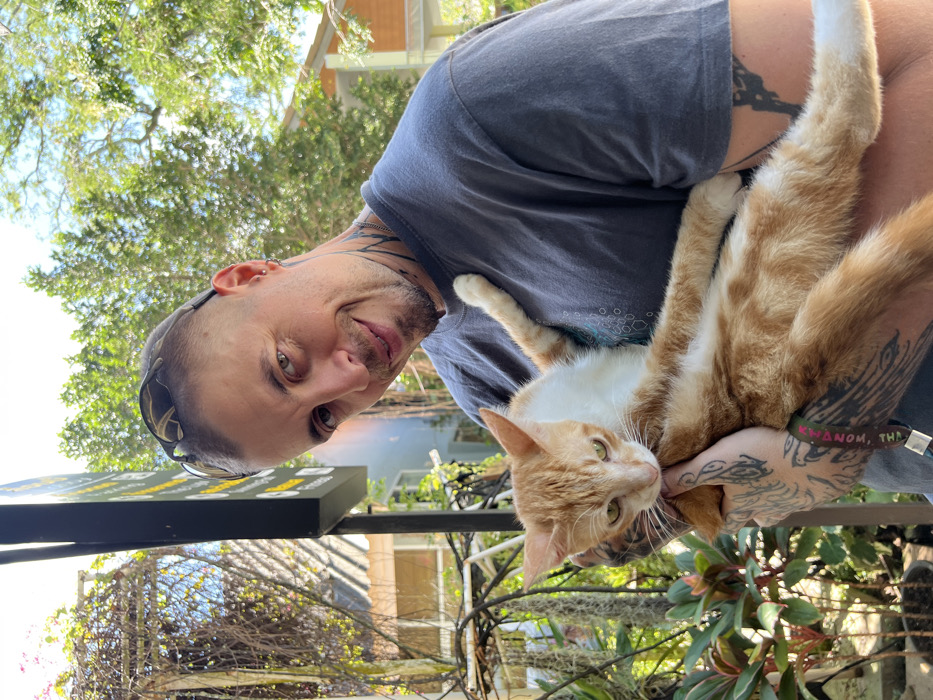 A man holds an orange and white cat. The man has short hair, tattoos on his neck and arms, and sunglasses propped on his head. The cat is held in the man's arms, its legs extended. They are outside, with trees visible in the background. A black sign with yellow lettering is partially visible on the left. The photo is slightly tilted to the side.