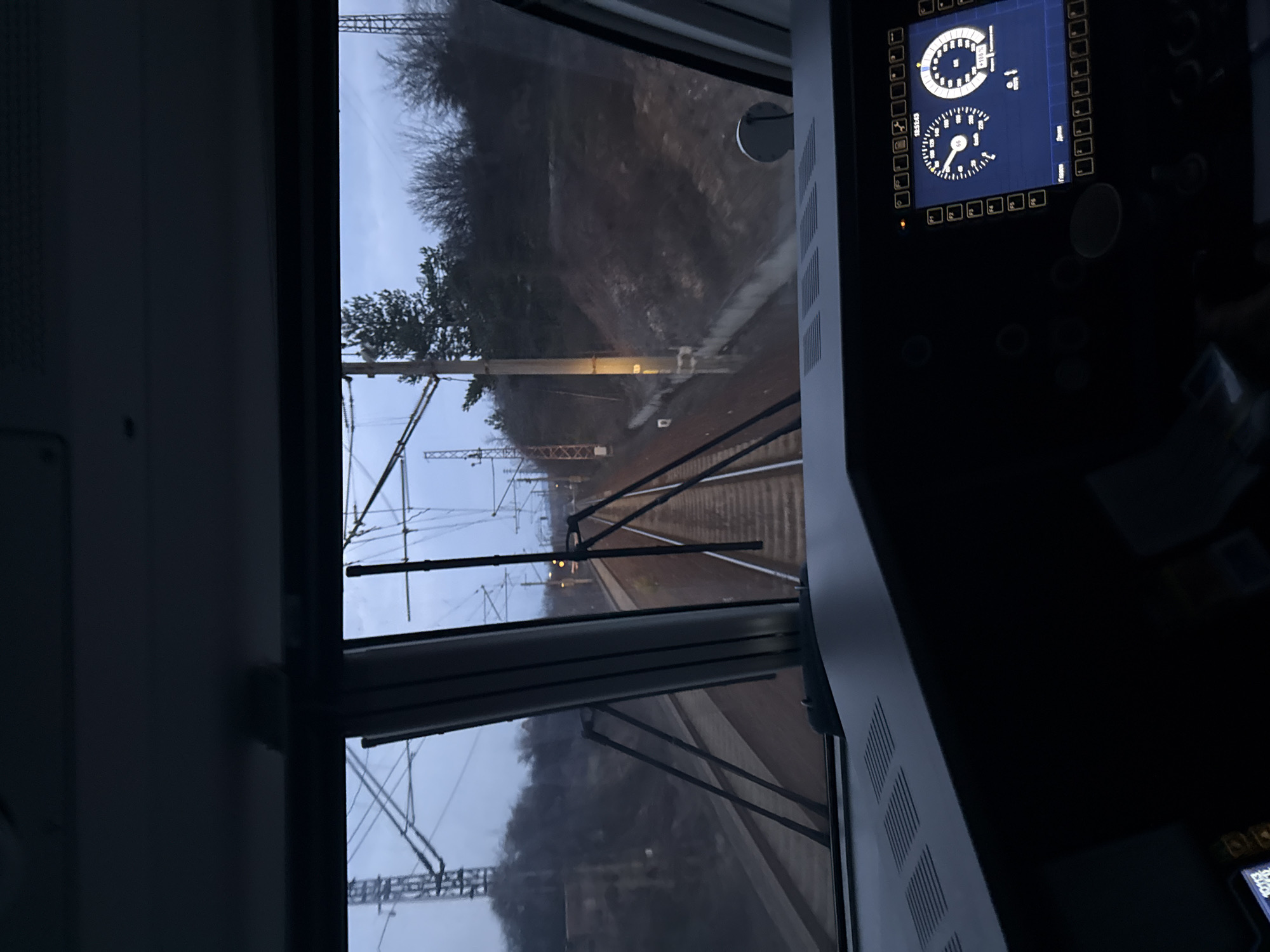 - "The scene depicts a forward view from inside a train's driver cabin, looking along electrified railway tracks in Vakarel, Bulgaria, during what appears to be twilight or an overcast day" by FM-dWyRh2, licensed under CC BY 4.0