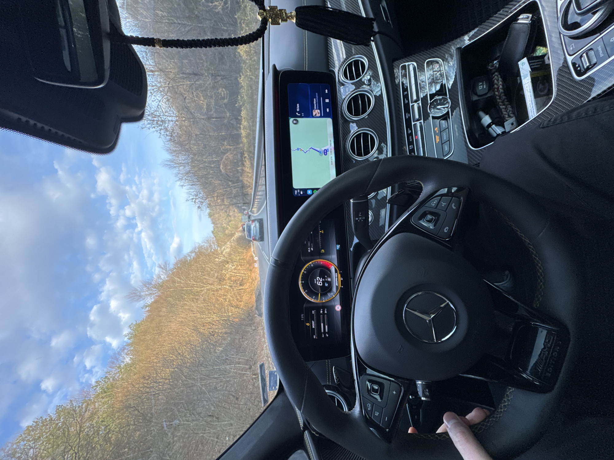 The scene depicts the interior view from a Mercedes-Benz AMG vehicle, observed from the driver's perspective, on a highway in Dolno Osenovo, Bulgaria. **People:** One human subject is visible: a left hand, gripping the black leather multifunction steering wheel at approximately the 9 o'clock position. **Subjects/Objects (Interior):** The vehicle's interior features carbon fiber trim on the dashboard and center console. The steering wheel has a central Mercedes-Benz logo and an "AMG Edition 1" emblem at its base. The digital dashboard displays "62 km/h" as the current speed, a boost gauge, "7.0°C" external temperature, "D" for drive, "12.3 l/100km" fuel consumption, and "49 km" remaining range, with "AMG" branding. A head-up display (HUD) projects "62" km/h onto the windshield. The infotainment screen shows a navigation map with a route, indicating "15 km" remaining to a segment and a total trip distance of "149 km" with an ETA of "8:01". Below the map, a music player widget displays "Umritten - Bördertäler Biedingfeld". The center console includes circular air vents, climate controls, a small analog clock, and a storage compartment. This compartment contains a set of car keys, a woven bracelet, and a small white box. A 12V power outlet is visible within the compartment. A dark braided cord with a golden cross and tassel hangs from the rearview mirror assembly. **Subjects/Objects (Exterior):** The vehicle is traveling on an asphalt highway with at least two visible lanes in the direction of travel. A guardrail lines the right side of the road. Ahead, two other vehicles are visible, the closest being a dark sedan. Both sides of the highway are flanked by wooded hillsides. The trees are predominantly deciduous, appearing bare with brown foliage on the ground, indicating a late autumn or winter season. The sky above is partly cloudy with patches of blue. **Actions/Interactions:** A person is operating the Mercedes-Benz AMG vehicle, driving at 62 km/h on the highway, while the navigation system is active.