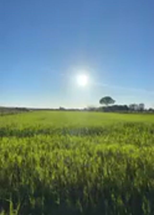The camera is positioned low in a vibrant green field, likely wheat or another grain, under a clear, bright blue sky