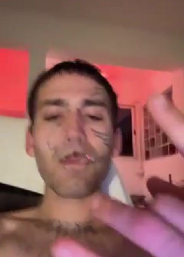 A fair-skinned, shirtless person with short dark hair, facial and neck tattoos, and a nose ring is seen from the chest up. The individual has a cigarette or joint in their mouth. They make a hand gesture resembling devil horns. The person looks toward the camera, but their eyes are looking down. The background appears to be a sparsely decorated room with a red light and a window. Music is playing.