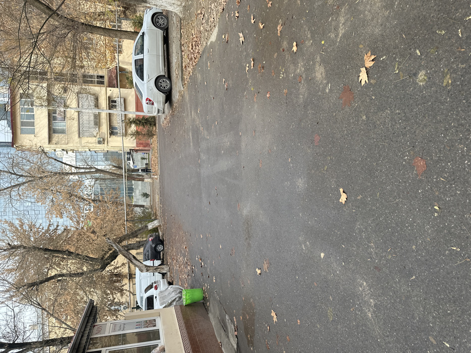 A street view shows cars parked along the side, with fallen leaves scattered on the asphalt. A multi-story building stands to the left, partially obscured by bare trees. A white van and a dark-colored car are parked near a building with a commercial storefront. A green bucket is visible near the van. The scene presents an urban landscape during the autumn season.