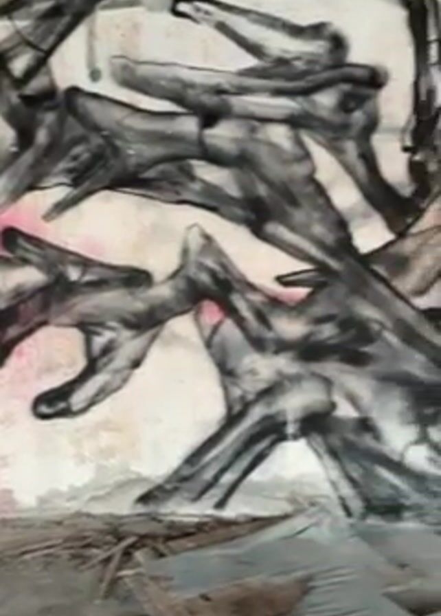 The video presents a close-up view of a graffiti mural on a distressed wall. The mural is predominantly black and gray, featuring abstract forms reminiscent of distorted hands or branches interweaving with each other. A splash of pink and orange hues is visible towards the lower center of the mural, adding a focal point of color. The wall shows signs of wear and tear, with patches of exposed concrete and peeling paint. In the foreground, the floor is covered with debris, including splintered wood and fragments of plaster, suggesting that the space is abandoned or under renovation. The camera slowly pans across the mural, offering different angles of the artwork and its integration with the dilapidated surroundings.