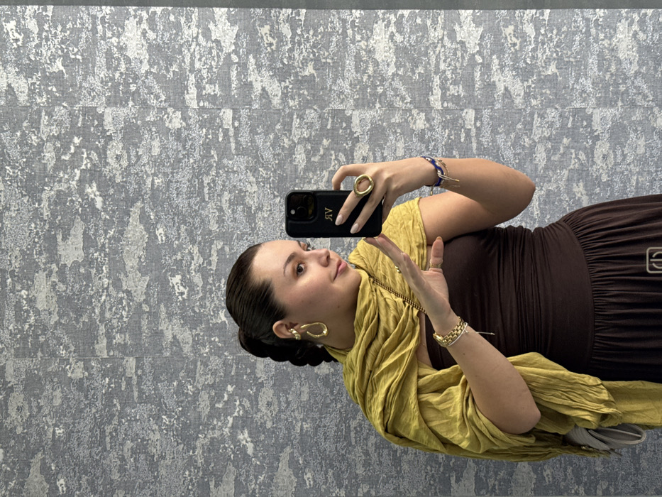 A woman is depicted taking a mirror selfie in Puebla City, Mexico. She has dark hair styled in a braid, a fair complexion, and a slight smile, looking towards her phone's reflection. She is wearing a dark brown strapless dress and a crinkled mustard yellow scarf draped over her shoulders. Accessories include gold-toned teardrop earrings, a visible gold chain necklace, a gold-toned bracelet on her left wrist, and multiple colorful bracelets on her right wrist. A prominent gold-toned, loop-shaped ring is on her right index finger. She holds a black smartphone, featuring a gold "RV" monogrammed case, in her right hand. Her left hand is raised, fingers slightly parted. A light grey shoulder bag is partially visible on her left side, obscured by the scarf. The background behind the woman is a reflective surface displaying a textured wall with an abstract gray and white pattern.