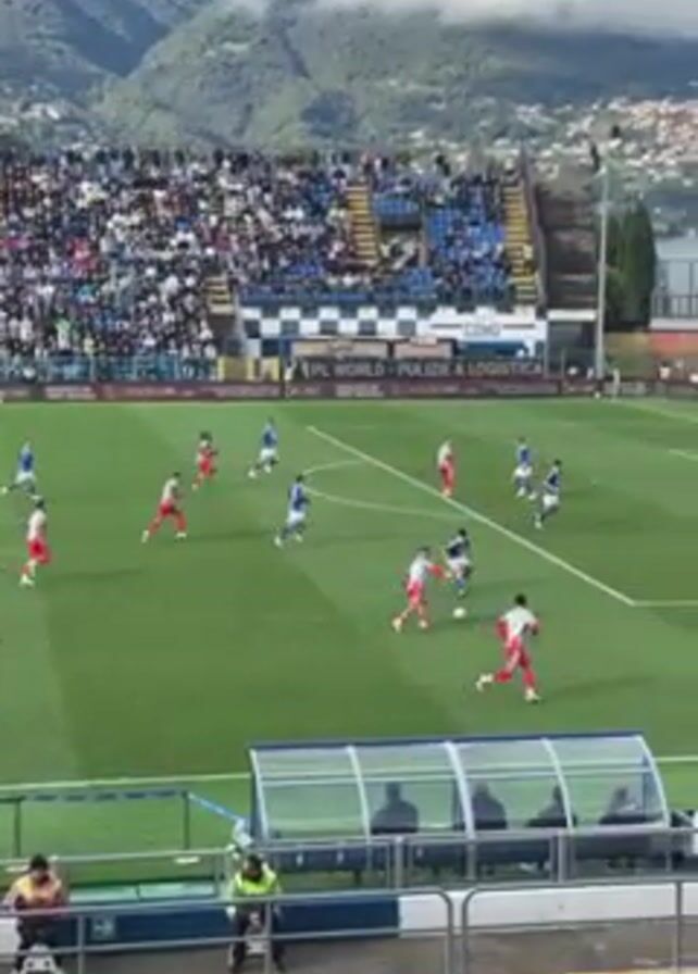 A soccer match is in progress on a green field, viewed from a slightly elevated position beside the team benches. The two teams are in blue and red uniforms, actively playing with the ball. The blue team is on the offensive, nearing the red team's goal. Spectators fill the stadium stands, primarily dressed in white or blue clothing, their faces not clearly visible. The stadium is situated against a scenic backdrop of mountains and partial cloud cover. Banners with the words "COMO" and "PL WORLD - PULIZIE & LOGISTICA" are displayed along the back of the stadium. A security guard in a bright yellow vest is seen near the benches. The video ends as a shot is taken and the ball goes into the net.