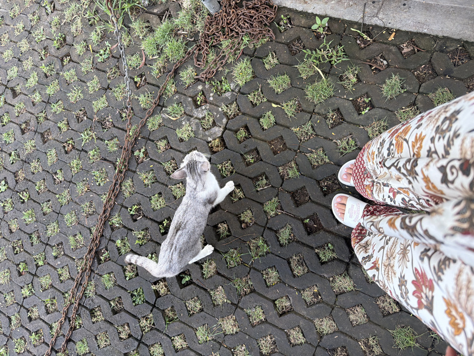 A gray and white cat stands on its hind legs, reaching upwards near a rusty chain laid diagonally across a patterned brick surface interspersed with grass. The view is from above, capturing the cat's back and upturned head. To the right, a person's feet wearing white sandals and floral-patterned pants are visible, suggesting they are the observer or subject interacting with the cat.
