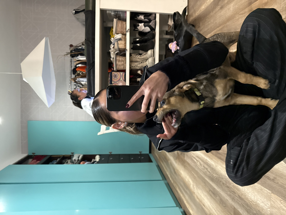 The image depicts an indoor scene in Mexico City, Mexico, featuring two individuals and a dog. In the foreground, a female is seated cross-legged on a light wood-patterned floor, her face largely obscured by a black smartphone held in her right hand, positioned as if taking a mirror selfie. She wears a black jacket and dark pinstriped pants. A small, brindle-coated dog with a light green collar stands on her lap, its mouth open wide showing teeth and tongue, seemingly barking or interacting with the female's left hand, which is near its mouth. In the background, visible in the reflection of a mirror-like surface, another female with dark hair is seated at a white desk or vanity, looking down at an object in front of her. The room features a prominent turquoise-colored closet or wardrobe unit on the left, with one door slightly ajar. The background wall has light gray wallpaper with a subtle geometric pattern. A long, white storage unit or dresser to the right holds various items, including woven baskets, boots, and other shoes. A clothing rack with garments and accessories is situated behind this unit. A large, white, geometric pendant light fixture hangs from the ceiling.