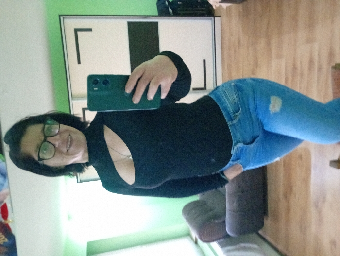 An indoor scene depicts a woman taking a mirror selfie. The woman, with dark, shoulder-length hair and black-framed glasses, smiles faintly. She is wearing a black long-sleeved top with a diagonal cut-out over the upper chest, revealing a delicate necklace. Her lower attire consists of light blue distressed jeans with a rip on the left thigh. She holds a dark green smartphone, featuring two rear camera lenses, in her left hand, extended towards the mirror to capture the image. Her right hand is placed into her jeans pocket. The background reveals an interior space with light green walls on the left and a large white wardrobe with dark rectangular accents on its sliding doors to the right. A brown, tufted upholstered armchair is visible on the left side of the frame, behind the woman. The floor is light-colored wood or laminate. The setting is an indoor residential environment, located in Alfatar, Bulgaria.