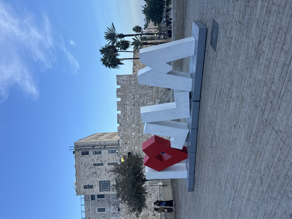 - "This image depicts the "I ❤️ JLM" sculpture positioned on a paved plaza near the Old City walls in Jerusalem, Israel, likely in the vicinity of Jaffa Gate" by FM-jqiIm2, licensed under CC BY 4.0