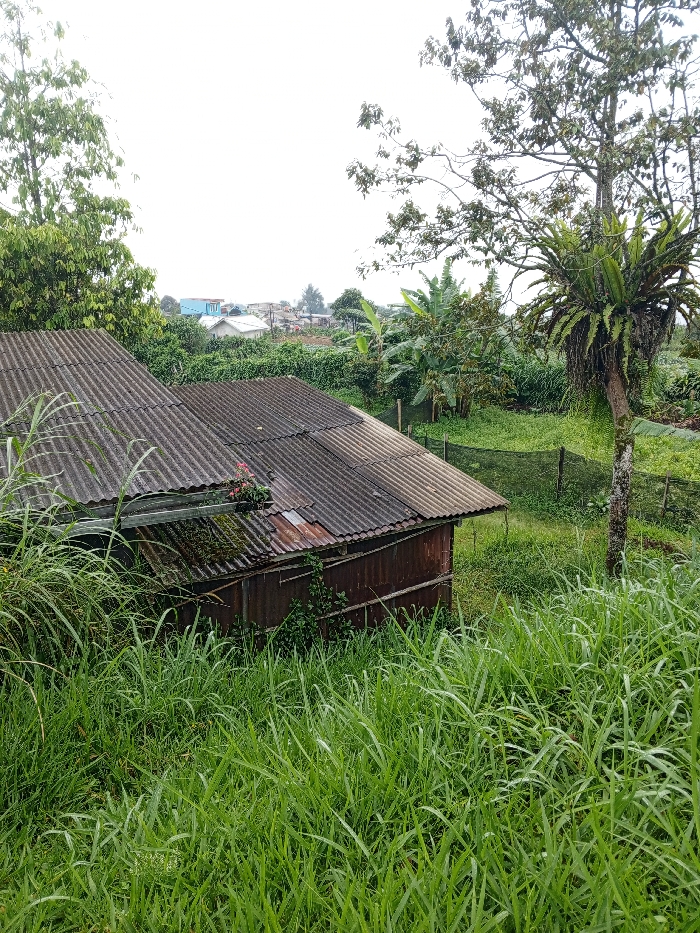 A dilapidated, weathered corrugated metal shed sits amidst dense green grass. Its roof is mossy and partially broken, with small plants growing out of a gap. Behind the shed, a wire fence separates it from a lush landscape with trees, banana plants, and ferns. Distant houses are visible in the background. The scene is overcast with a hazy, muted light.