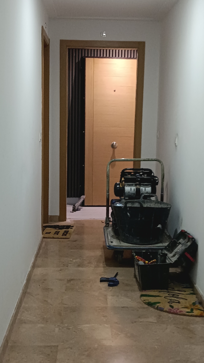 The image displays an interior hallway, likely within a residential or commercial property in Sagunto, Spain. The hallway features white-painted walls on both sides and a light brown, tiled floor. At the far end, a light-colored wooden door, equipped with a silver doorknob and a peephole, is slightly ajar, revealing a darker, vertically slatted structure and a lighter floor surface beyond its threshold. To the immediate left, a wooden doorframe opens into an adjacent room, where a yellow doormat with dark lettering is partially visible on the floor. Along the right wall of the hallway, a black-colored piece of heavy machinery, possibly a plate compactor, is positioned on a blue-framed utility cart with visible wheels. Adjacent to this equipment, an open black toolbox containing various hand tools, including screwdrivers, rests on the floor. A semi-circular, floral-patterned mat is partially visible underneath the toolbox. A blue clamp or similar tool lies on the tiled floor closer to the center of the hallway. In the room visible through the open door at the end of the hallway, a silver-colored elongated object lies on the floor. Two small metal hooks are affixed to the white ceiling near the far door. No individuals are present in the scene.