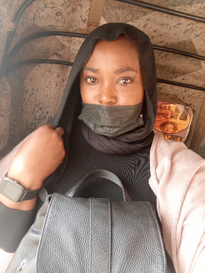 A dark-skinned individual, appearing female, is depicted in a medium-shot, facing the camera directly. She wears a black hijab, a dark grey pleated surgical-style face mask covering her nose and mouth, and a dark, possibly ribbed, long-sleeved top. A light pink or beige garment is draped over her right shoulder and arm. A black smartwatch with a rectangular face is visible on her left wrist, and her left hand is positioned near her left ear, adjusting or holding the edge of her hijab. A black, textured, leather-like backpack or bag is in the lower foreground, partially obscuring her torso. The background appears to be the interior of a vehicle, indicated by a patterned fabric lining and a dark metal bar positioned behind her head. On the right side of the background, a partially visible poster or sticker displays text, including "ERGYESS" and "IV 4", along with a fragment of a face. The exact location within Barden Yana, Nigeria, is not visually discernible from the image.