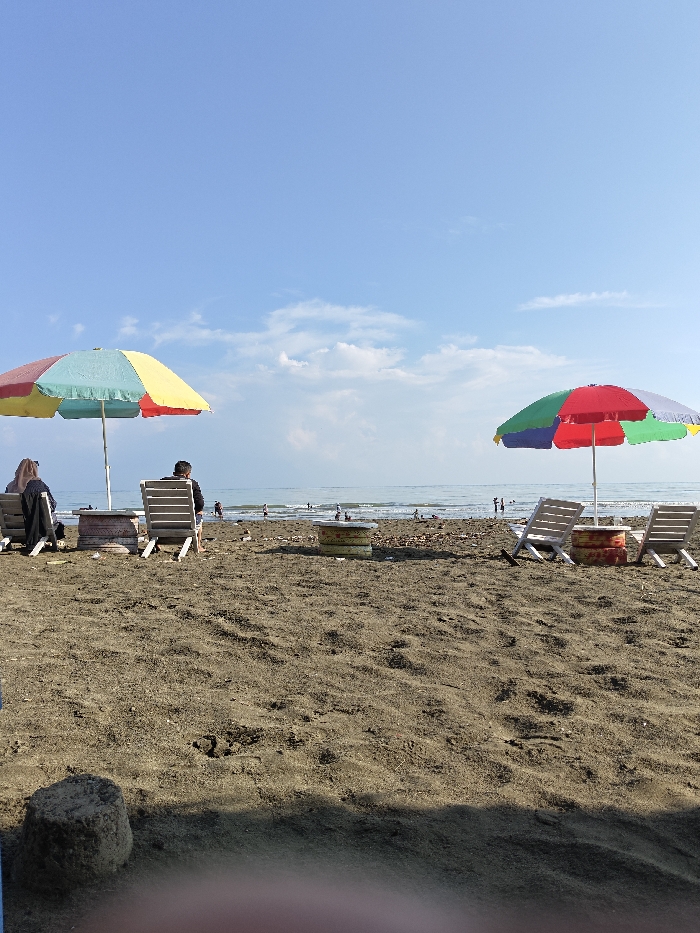 The image displays a daytime beach scene in Reudeuep, Indonesia. The sky is largely clear blue with scattered white clouds. The sandy beach occupies the foreground and midground, leading to the ocean at the horizon, which appears calm with minimal waves. In the midground, two distinct seating areas are arranged. On the left, a large beach umbrella with red, green, yellow, and light blue panels is open. Beneath it, two white, slatted lounge chairs face the ocean. A cylindrical table, yellow with red bands, stands between the chairs. A person wearing a dark top and light head covering is seated in the left chair, partially visible from the back. Another individual, a male with dark hair wearing a dark shirt, is seated in the right chair, facing away from the camera towards the ocean. To the right, a second identical multi-paneled beach umbrella (red, green, blue, yellow) is open, also casting shade. Two more white, slatted lounge chairs are positioned beneath this umbrella, facing the ocean, with a similar yellow and red cylindrical table between them. These chairs are unoccupied. In the background, numerous indistinct figures are visible in the shallow ocean waters, engaged in wading or swimming. The sand near the waterline shows scattered dark debris or small stones. A dark, lumpy, cylindrical object is present on the sand in the bottom-left foreground. The very bottom of the frame is blurred with a reddish-purple hue, consistent with a finger or hand partially obscuring the lens. The scene is brightly lit by direct sunlight.