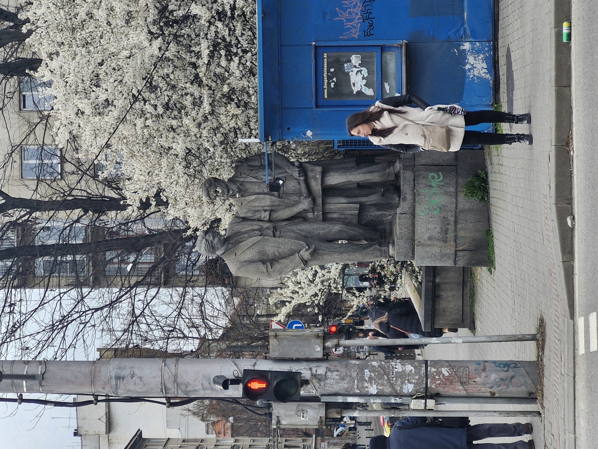 street scene in Sofia, Bulgaria, featuring the Monument to the Soviet Army. A woman in a light coat, black pants, and boots stands near a blue kiosk next to the monument. The monument is a large, gray stone sculpture of several figures. Behind the monument, a tree is in full bloom with white flowers. In the background, there are buildings. A traffic light shows red. People are visible in the foreground passing in the street, some wearing dark coats. Graffiti is present on the kiosk and the traffic light pole. A green and silver can sits on the sidewalk. The sidewalk is paved with square blocks.