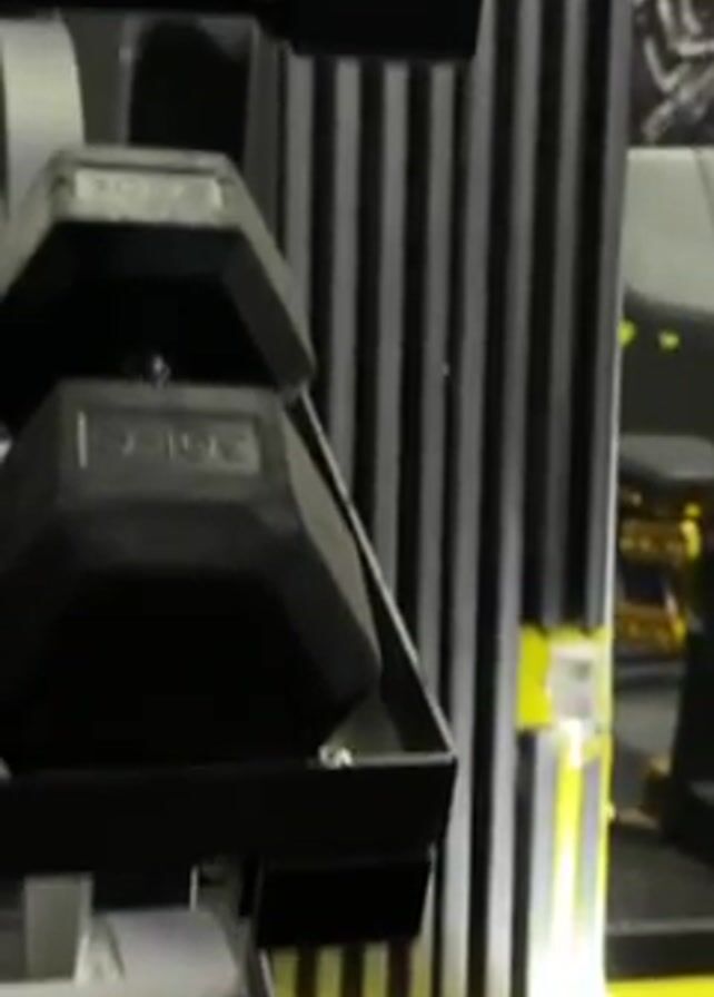black, multi-tiered dumbbell rack with rubber-coated, hexagonal dumbbells on each level. The second tier from the top has a pair of 30-kilogram dumbbells. Behind the rack is a wall with alternating black and gray vertical stripes and a yellow trim near the floor. Part of a poster is visible to the upper right. The camera is stationary.