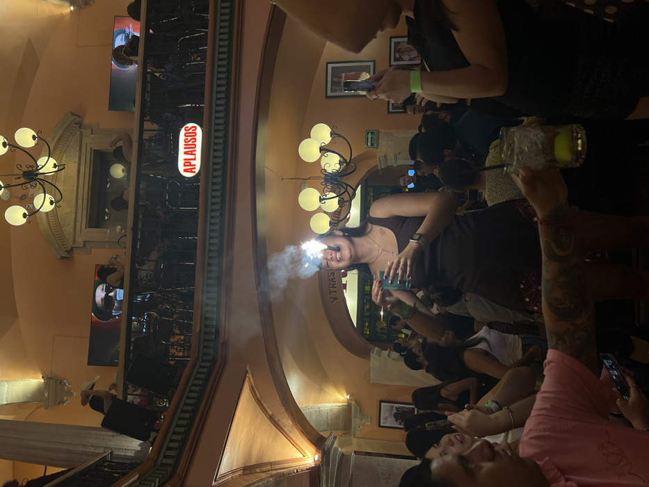 The image depicts a lively indoor scene within a multi-level entertainment venue in Guanajuato City, Mexico. The environment features warm, orange-brown walls, arched doorways, and decorative architectural elements, illuminated by chandeliers and wall sconces. At the approximate center of the lower level, a female subject with dark hair, wearing a dark sleeveless top, stands with a light blue cocktail in her left hand. A pyrotechnic device, resembling a sparkler, is held in her mouth, emitting bright sparks and white smoke upwards. She exhibits an expression of amusement or celebration. Surrounding this central figure is a dense crowd of patrons. In the lower-left foreground, a male subject in a light pink shirt with visible arm tattoos holds a mobile phone. To the right of the central female, a partially visible individual wearing a green wristband also holds a mobile phone, aiming it towards the central action. Multiple other patrons throughout the mid-ground are observed holding mobile phones, seemingly recording or photographing the event. A hand in the lower-right foreground holds a clear glass containing a beverage with a lime wedge. Above the main floor, a balcony level encircles the space, occupied by additional patrons seated at tables. Multiple flat-screen televisions are mounted above the balcony, displaying close-up images of an individual wearing sunglasses and with tape across their mouth. A prominent red illuminated sign on the balcony railing spells "APLAUSOS." Speakers are also positioned on the balcony. Architectural details include ornate railings and a visible green "EXIT" sign on a wall on the main level. The scene captures a crowded and active social gathering.