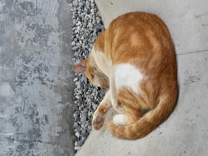 - "A domestic cat is observed sleeping, curled into a tight ball, on a light grey concrete surface" by FM-8CAHW2, licensed under CC BY 4.0