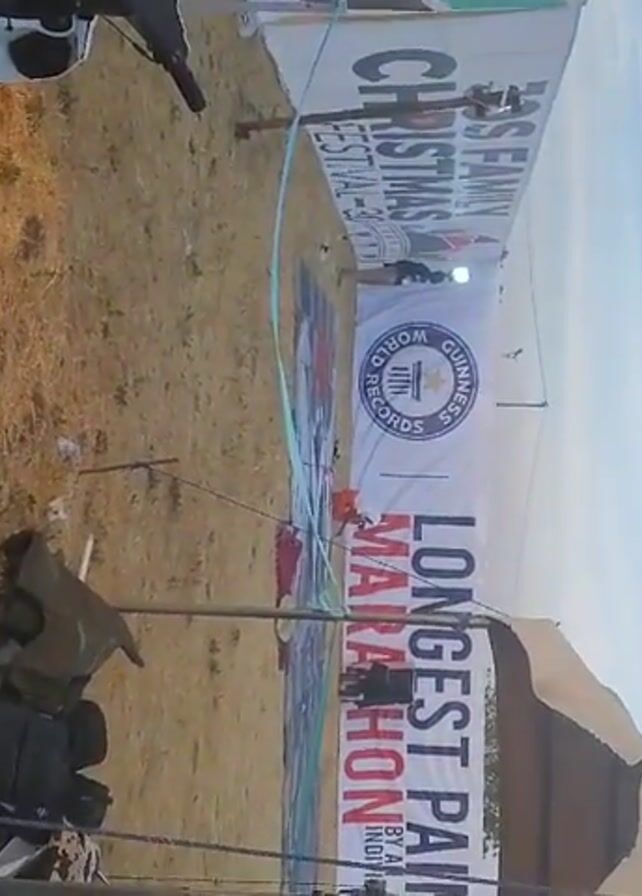 The camera, seemingly from within a tent, offers a view across a field towards a Guinness World Records banner proclaiming "Longest Painting Marathon