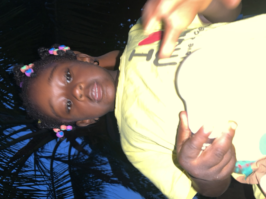 A close-up, low-angle image depicts a young Black child in Akwanga, Nigeria. The child has dark skin, wide-open dark eyes directed at the viewer, and a slightly open mouth. Her dark hair is styled in multiple small braids or pigtails, each adorned with colorful spherical beads in shades of pink, blue, yellow, and green. Small black hoop earrings are visible in both earlobes. She wears a light yellow short-sleeved t-shirt featuring black and red text on the chest, including the distinct characters "I ❤️ U". In the lower left foreground, her dark-skinned left hand holds a smooth, light-colored, unidentifiable object. Her right hand, in the lower right foreground, is blurred, indicating motion. The background consists of a dark blue sky with the silhouettes of palm fronds, indicating an outdoor setting at dusk or night.