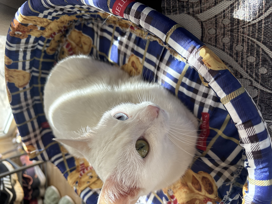 - "An indoor scene in Krichim, Bulgaria, depicts a white domestic cat resting within a soft, patterned pet bed" by FM-ifgHK2, licensed under CC BY 4.0