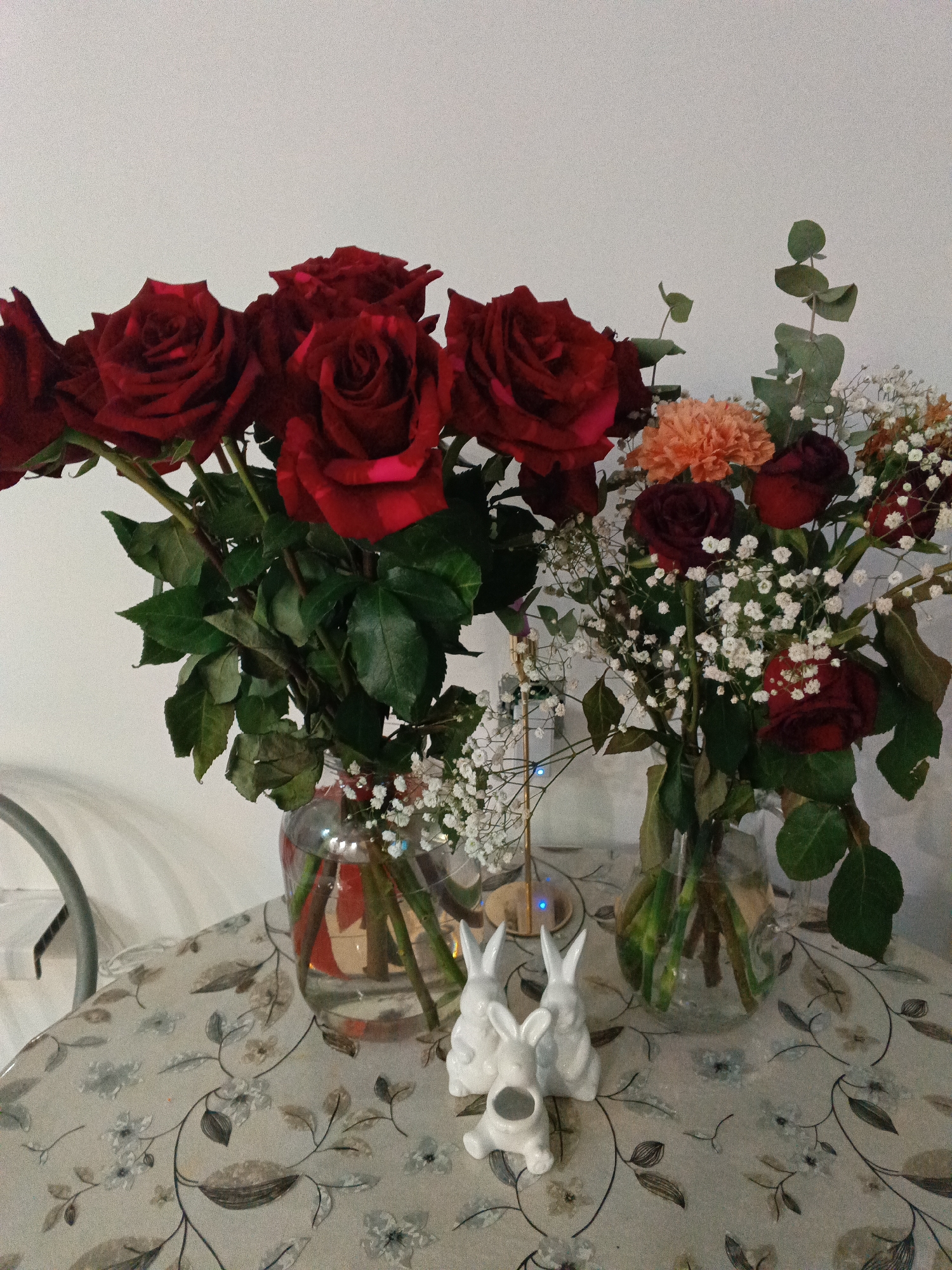 Two glass vases filled with flowers sit on a round table covered with a floral patterned tablecloth. The vase on the left contains mostly red roses. The vase on the right contains red roses, a light orange flower, eucalyptus, and baby's breath. Between the vases, there is a small white ceramic sculpture of three rabbits. The background is a plain white wall. This image was taken in Andreyevo, Russia.