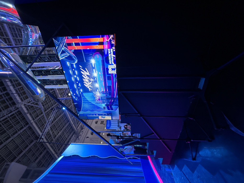 - "The scene depicts an indoor event space in Dolgoprudny, Russia, characterized by a large LED screen, an elevated viewing platform, and prominent blue and purple lighting" by FM-pcSm62, licensed under CC BY 4.0