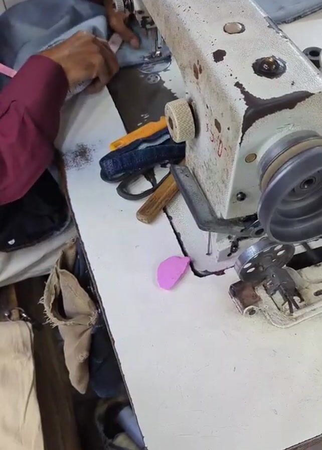 A person is using a sewing machine on a white table. The sewing machine is old and white with some rust spots. The person is sewing a piece of blue denim fabric. A measuring tape, scissors, a wooden tool, and pink tailor's chalk are on the table next to the sewing machine. There is a bag to the left of the table, filled with fabric scraps. The person is wearing a maroon shirt. The scene appears to be a tailoring or alteration workshop.