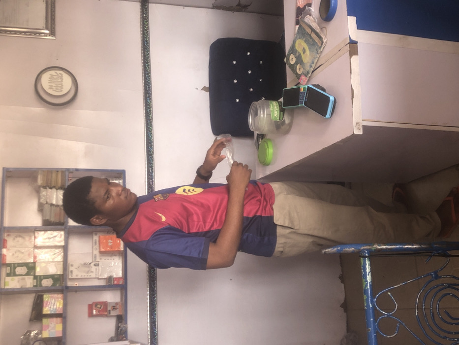 An indoor retail establishment in Tukur Tukur, Nigeria, displays a young adult male standing behind a counter