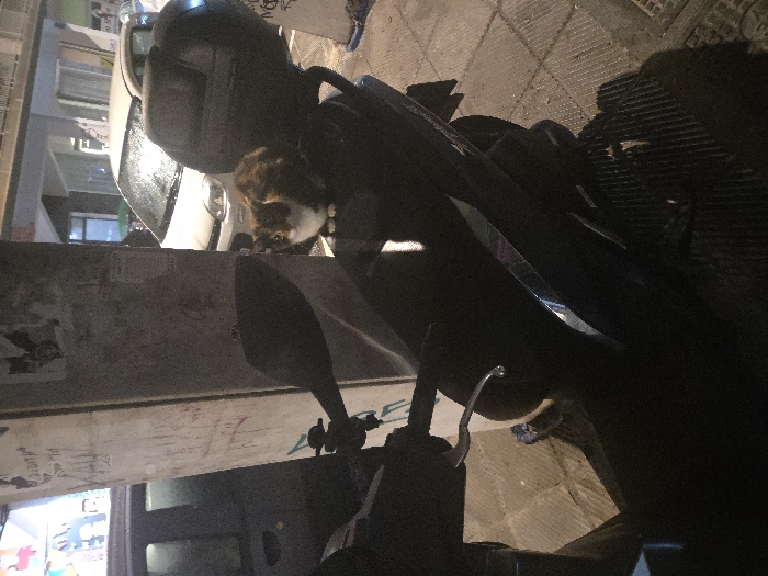 A motorcycle dominates the frame, its black structure contrasted against a light-colored street scene. A car is visible behind the motorcycle's seat, where a cat sits. The street is paved and has a striped pattern. The background includes a building with visible windows and advertisements. The lighting suggests either early morning or late evening.
