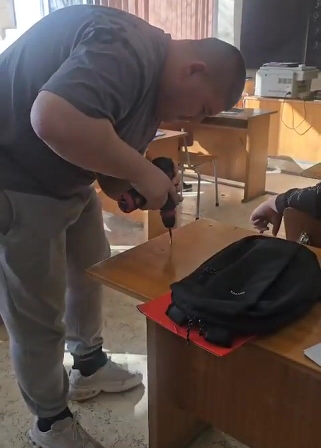 A man is using a cordless drill to bore a hole in the top of a wooden desk. The man has a shaved head and is wearing gray sweatpants, a gray t-shirt and white sneakers. He stands in the classroom setting with several desks in the background. A black backpack rests on the desk next to the hole the man is drilling. A red paper rests under the backpack. The man’s right foot is white with a colored pattern. Sunlight is streaming in from a window with closed blinds. Another person stands slightly behind the man to the right with their hands near the desk. There is a printer on a desk to the left of the window.