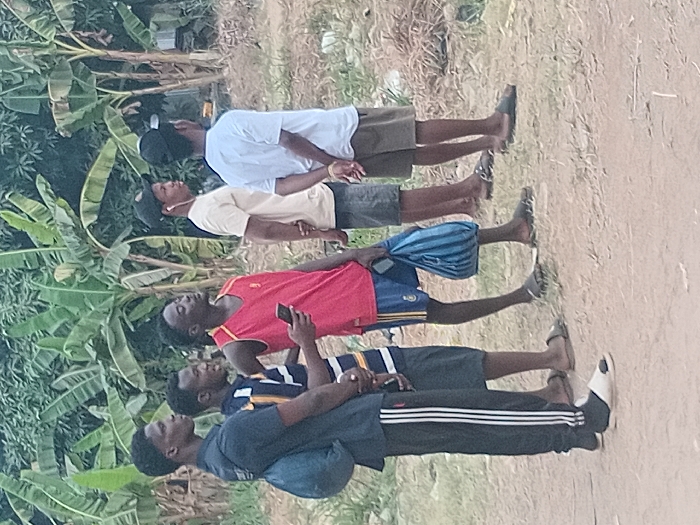 Four men stand in a line outside, dressed in casual clothing. The man at the front wears dark pants with white stripes and a dark t-shirt. The next man is wearing a blue shirt. The third man is wearing a red jersey and holding a phone in his hand. The last man is wearing a white t-shirt and Khaki shorts. All the men are wearing some form of sandals and are looking towards the sky. There are large green plants behind the men and a dirt background.