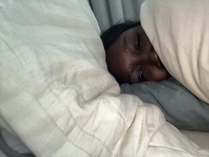 A person with dark skin and dark hair is partially obscured by white and beige bedding