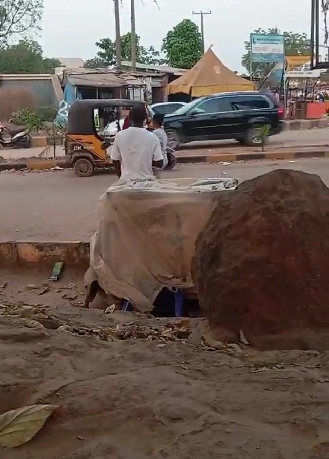 street scene with a man apparently working on something under a tarp covering a structure. There is a large dirt pile and a roadside gutter nearby. Other people walk along the sidewalk and vehicles travel on the street in the background. Overhead electrical lines and a few small buildings are visible. The sky is overcast.