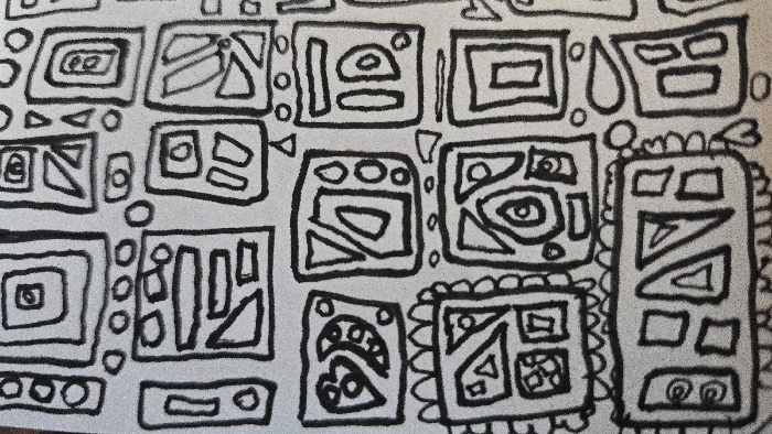 The image captures a close-up, overhead view of a light gray, granular surface, possibly a mat or textile, fully covered with a repeating pattern of hand-drawn or printed abstract geometric shapes in solid black. The pattern is composed of numerous rectangular and square outlines, often containing smaller internal shapes such as triangles, circles, ovals, and various curvilinear forms. Several of the larger rectangular elements are bordered by wavy or scalloped lines. The black lines are bold and display slight variations in thickness consistent with manual creation. No individuals, specific real-world objects, or active events are depicted. The scene is static, focusing exclusively on the textured, patterned surface. This item is located within the city of Lompoc, United States.