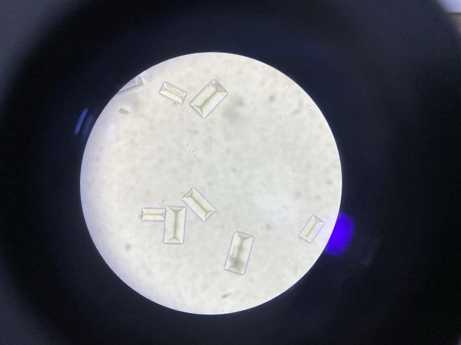 The image displays a microscopic field of view, consisting of a central circular illuminated area surrounded by an opaque black background. Within the illuminated circle, approximately ten translucent, yellowish-white, rectangular crystalline structures are visible, varying in size and orientation. These crystals are scattered across a bright, slightly granular background, with one crystal near the top appearing as two rectangular units perpendicularly joined. Numerous smaller, amorphous particles are also present throughout the field. A distinct purple-blue light artifact or reflection is situated along the bottom-left curve of the illuminated circular boundary. No individuals, actions, interactions, or environmental features are present to determine a specific geographic location in Recife, Brazil, or any other city.