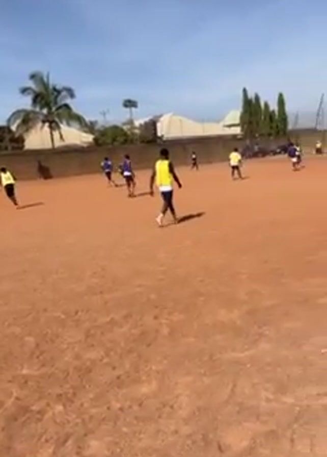 soccer game on a dirt field. Several players are on the field, some wearing yellow vests. A group of people are sitting on a ledge watching the game. One person is wearing a red Manchester United jersey. The weather appears sunny and the sky is blue. There are buildings and trees visible in the background.